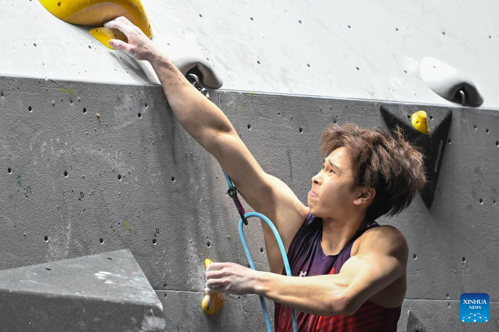 Pan Yufei of China competes during the men's lead qualification at the IFSC World Cup Wujiang 2025 in Suzhou, east China's Jiangsu Province, April 25, 2025. (Photo by Wang Xuzhong/Xinhua)