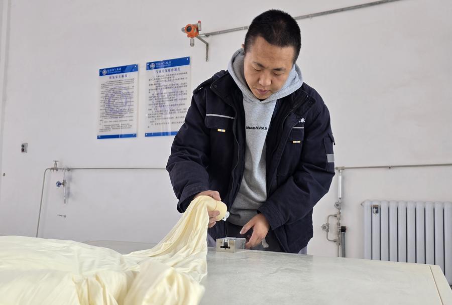 This photo taken with a mobile phone shows a staff member inflating a weather balloon at the Tuotuohe Meteorological Station in northwest China's Qinghai Province, March 21, 2025. (Xinhua/Li Linhai)