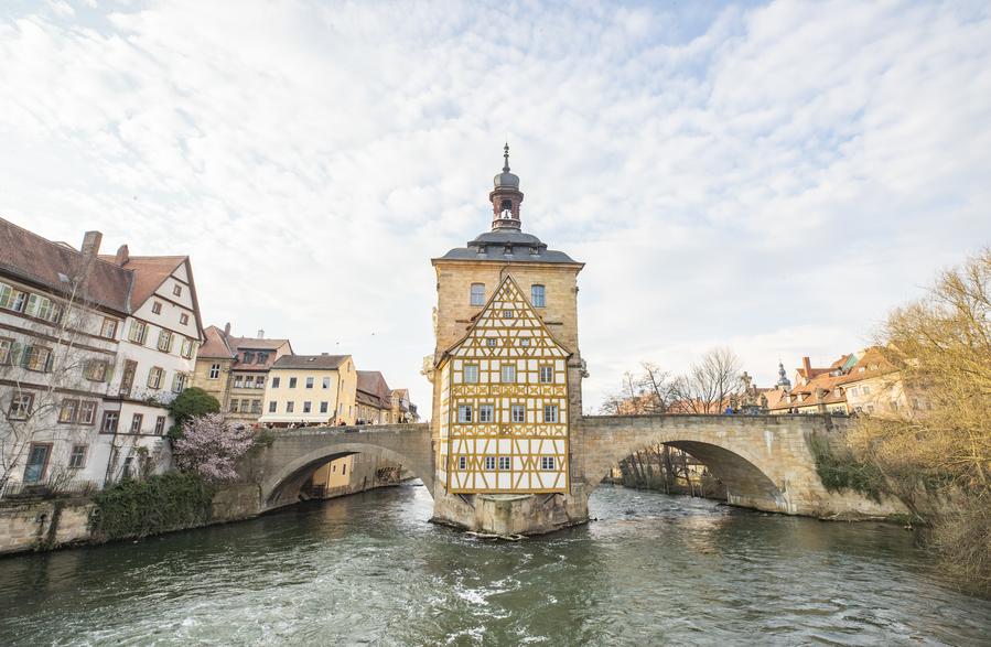 This photo taken on March 23, 2025 shows iconic building of the ancient town of Bamberg, the former town hall built on Regnitz River, in Bavarian state, Germany. (Xinhua/Zhang Fan)