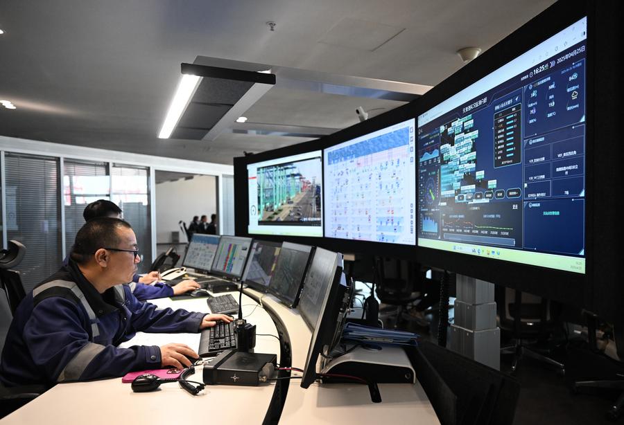 Workers adjust terminal equipment at the intelligent control center of Tianjin Port Second Container Terminal in north China's Tianjin, April 25, 2025. (Xinhua/Zhao Zishuo)