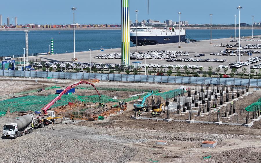 Workers work at the construction site of a vehicle logistics yard of the international ro-ro terminal of Tianjin Port in north China's Tianjin, April 25, 2025. (Xinhua/Zhao Zishuo)