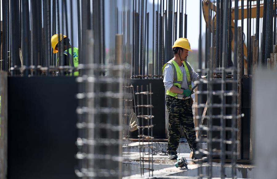 A worker works at the construction site of a new grain silo project of Tianjin Port in north China's Tianjin, April 25, 2025. (Xinhua/Zhao Zishuo)