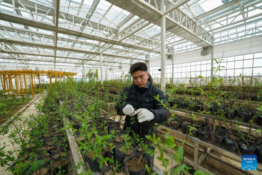 A staff member trims saplings at a tree cultivation base in Nagqu, southwest China's Xizang Autonomous Region, April 25, 2025. Nagqu City has an average altitude of 4,500 meters. Due to the unfavorable conditions for tree growth, such as permafrost, low temperature, frequent strong wind throughout the year, it was once the only prefecture-level city in China without trees used for urban greening.