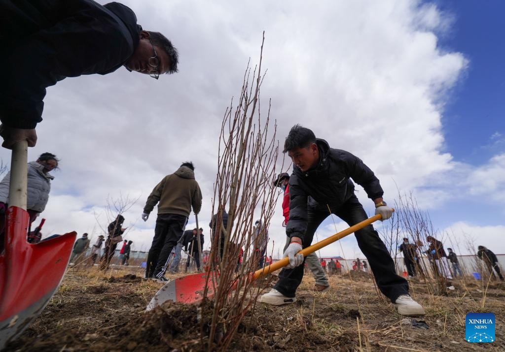 People take part in a voluntary tree-planting activity in Nagqu, southwest China's Xizang Autonomous Region, April 25, 2025. Nagqu City has an average altitude of 4,500 meters. Due to the unfavorable conditions for tree growth, such as permafrost, low temperature, frequent strong wind throughout the year, it was once the only prefecture-level city in China without trees used for urban greening.