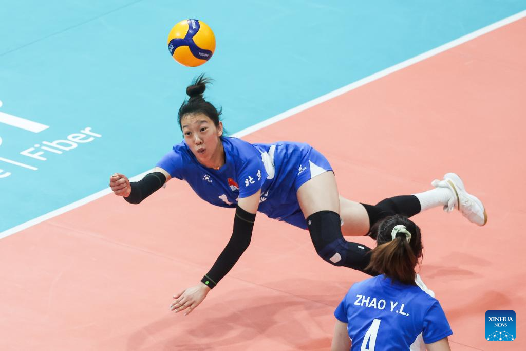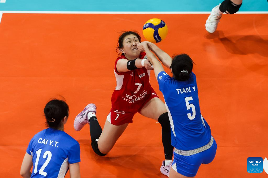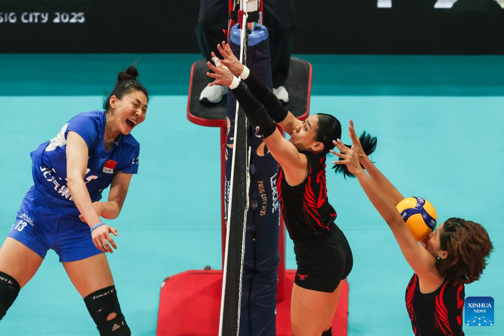 Lu Yufei (L) of China's BAIC Motor Volleyball Club competes during the quarterfinal match between China's BAIC Motor Volleyball Club and the Philippines' Petro Gazz Angels at the AVC Women's Volleyball Champions League in Pasig City, the Philippines, April 25, 2025. (Photo by ROUELLE UMALI/Xinhua)
