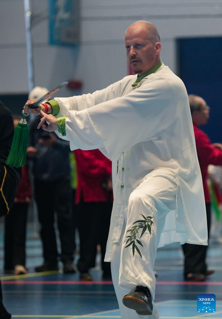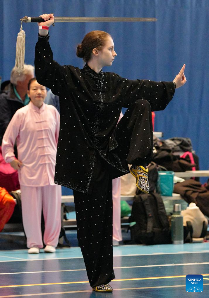 A contestant performs Taijijian during the 2025 Can-Am Martial Arts Championships in Richmond, British Columbia, Canada, April 26, 2025. (Photo by Liang Sen/Xinhua)