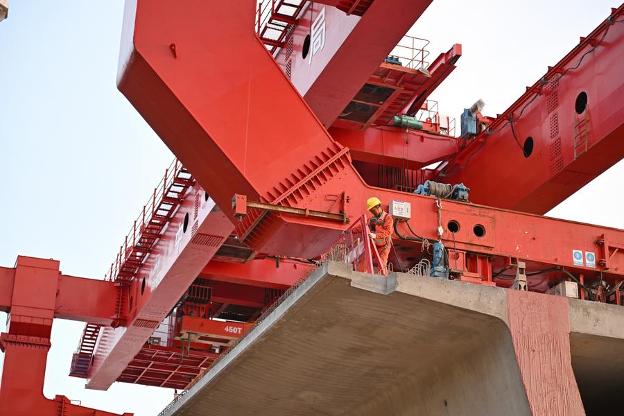 A worker erects a box girder at the construction site of a mega bridge in the Hebei section of the Xiong'an-Shangqiu high-speed railway in north China's Hebei Province, April 27, 2025. (Xinhua/Mu Yu)