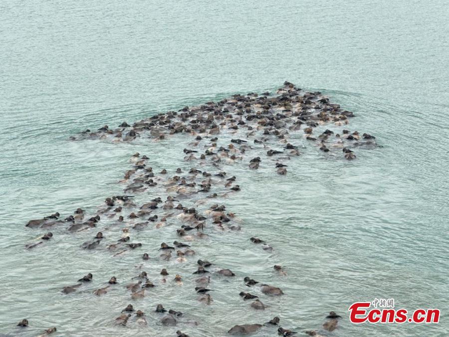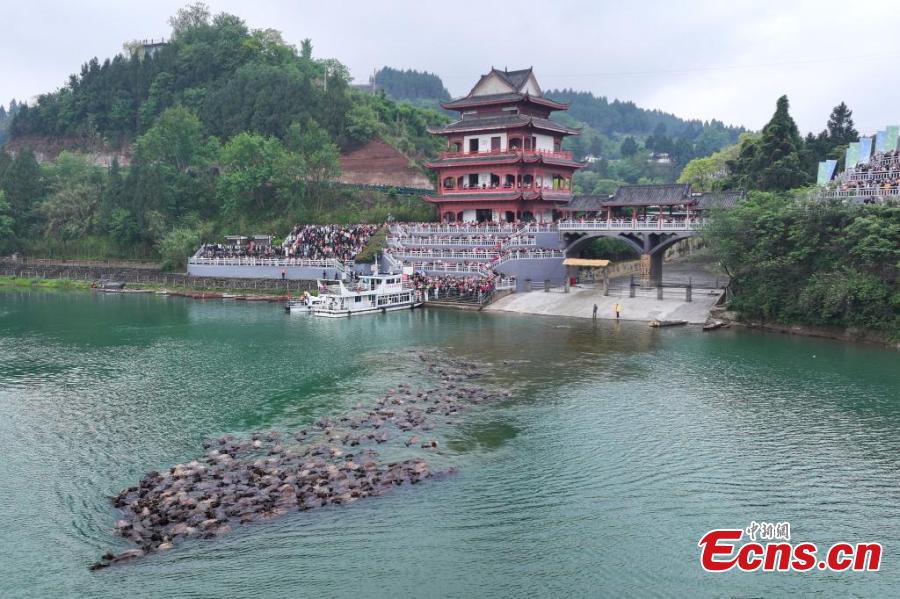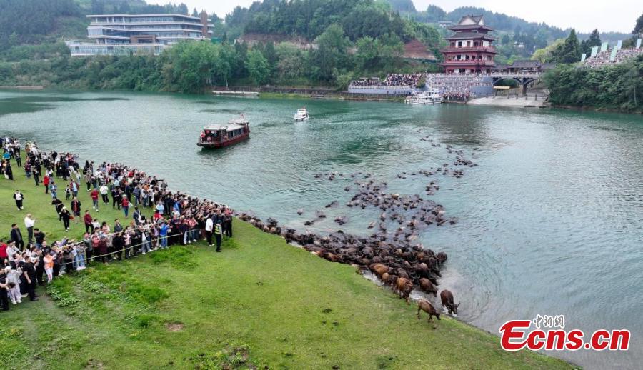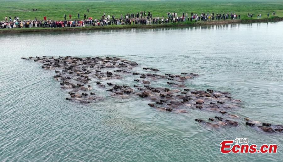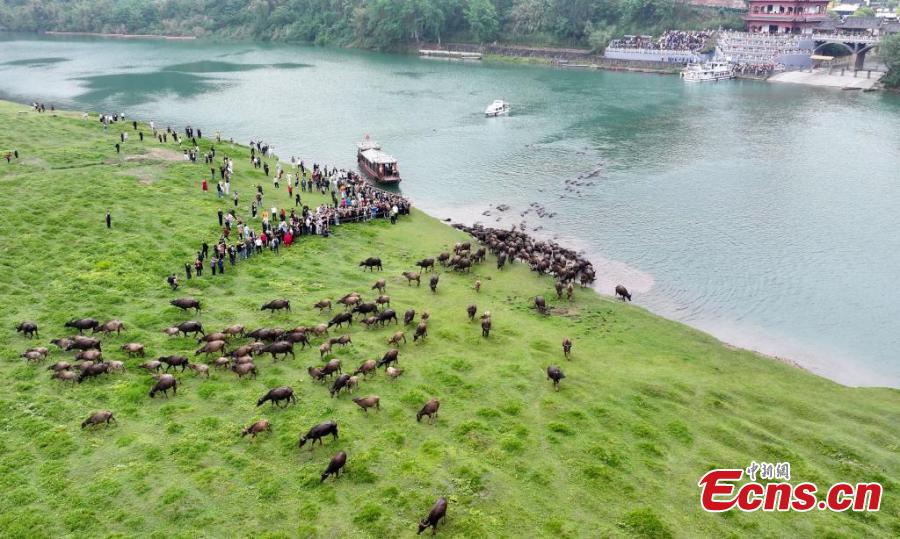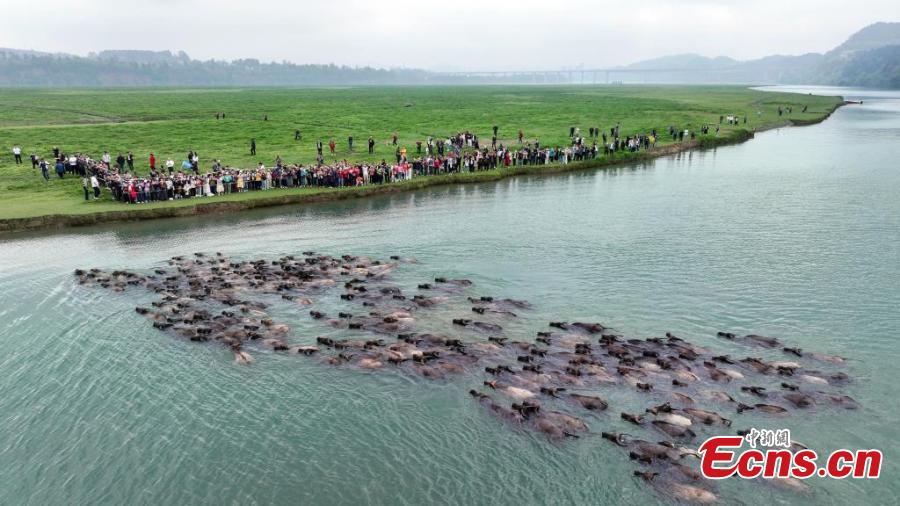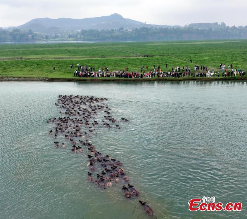 A spectacular view of a herd of buffaloes crossing the Jialing River to forage on Taiyang island, Peng'an county, southwest China's Sichuan Province, April 27, 2025. (China News Service/Liu Yonghong)