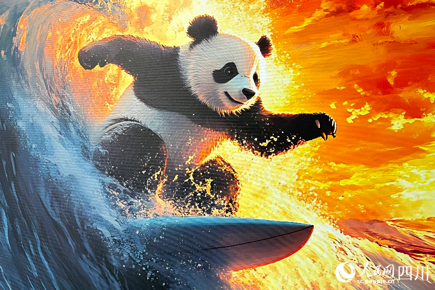 A giant panda-themed painting is displayed during the "Panda Homeland: Culture & Creativity Contest" exhibition at Beihu Ecological Park in Chengdu, southwest China's Sichuan Province. (People's Daily Online/Zhu Hong)