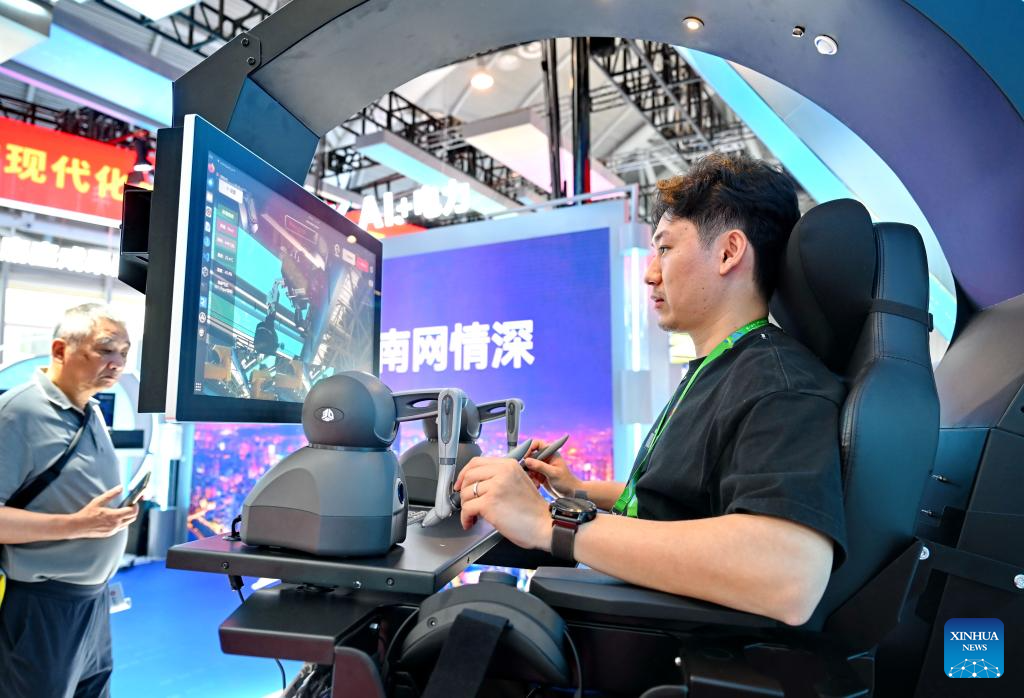 A staff member demonstrates to operate a robot at the experience area of the 8th Digital China Summit in Fuzhou, southeast China's Fujian Province, April 28, 2025. With more than 300 professional institutions attending, the 8th Digital China Summit opened its experience area to professional visitors on Monday, showcasing the nation's digital transformation achievements amid robust growth in the digital sector. (Xinhua/Lin Shanchuan)