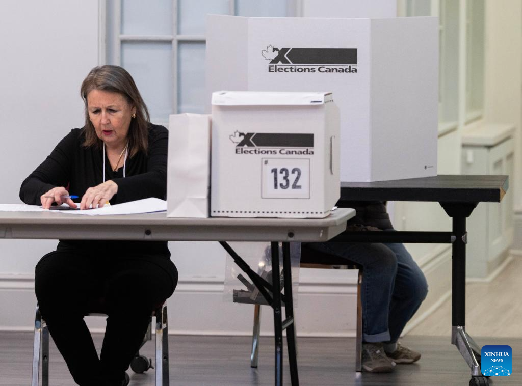 A woman works at a polling station in Toronto, Canada, on April 28, 2025. Millions of Canadians are lining up to cast their ballots on Monday as U.S. President Donald Trump weighed in on the election with a new threat of annexation of the country. (Photo by Zou Zheng/Xinhua)