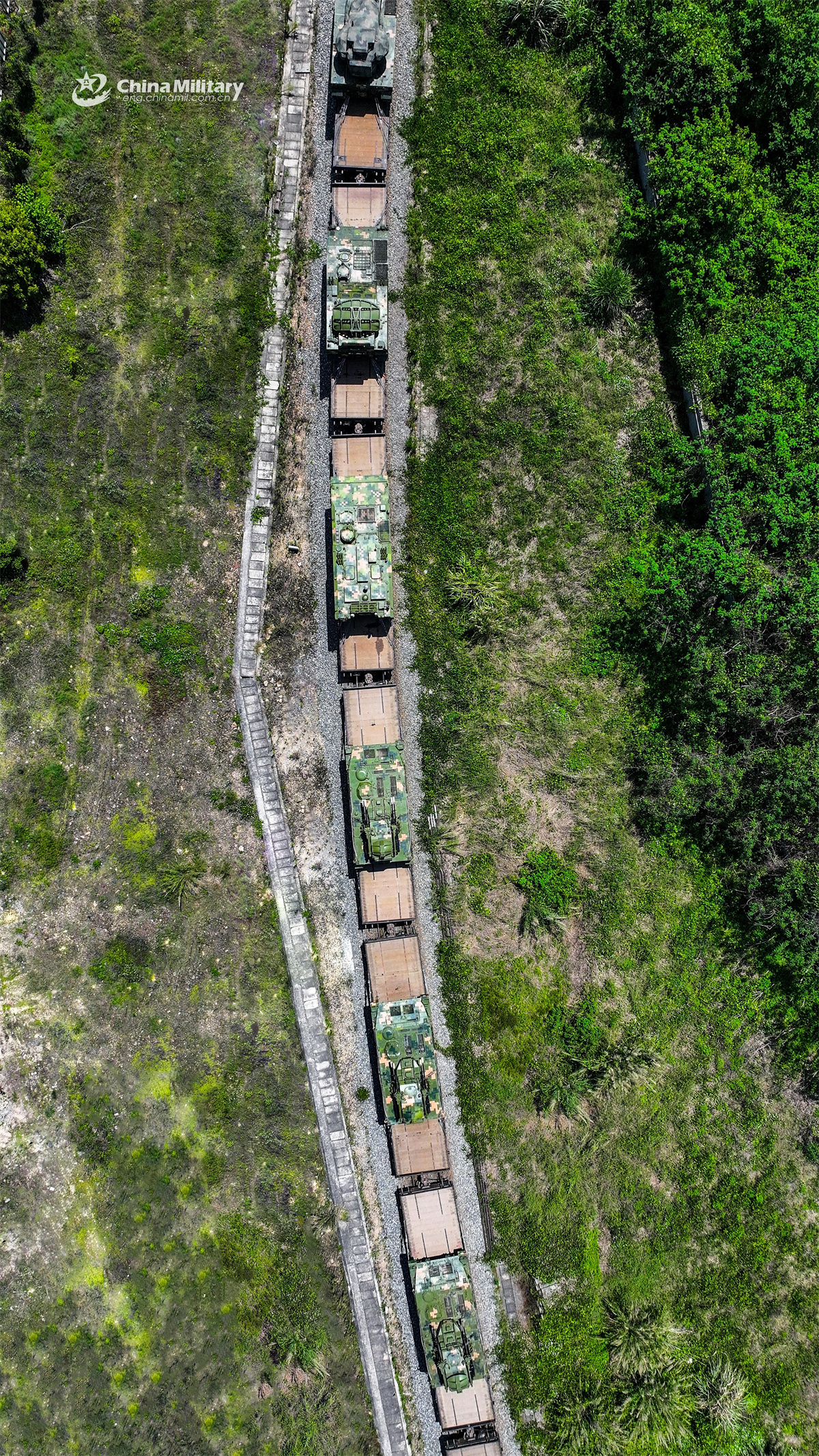 Armored vehicles attached to an air-defense unit with a brigade under the Chinese PLA 73rd Group Army are loaded onto the rail flat cars during a rail-load training exercise aiming to enhance the troops' long-distance transportation capability on April 23, 2025. (eng.chinamil.com.cn/Photo by Liu Zhiyong)