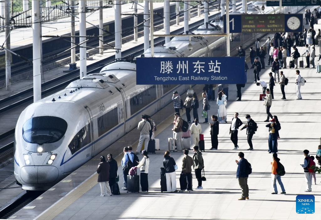 Passengers wait to board a train at Tengzhou East Railway Station in Tengzhou, east China's Shandong Province, April 29, 2025. China's railway network is expected to handle approximately 144 million passenger trips during the eight-day May Day holiday travel rush, which kicked off on Tuesday, the national railway operator said. (Photo by Li Zongxian/Xinhua)