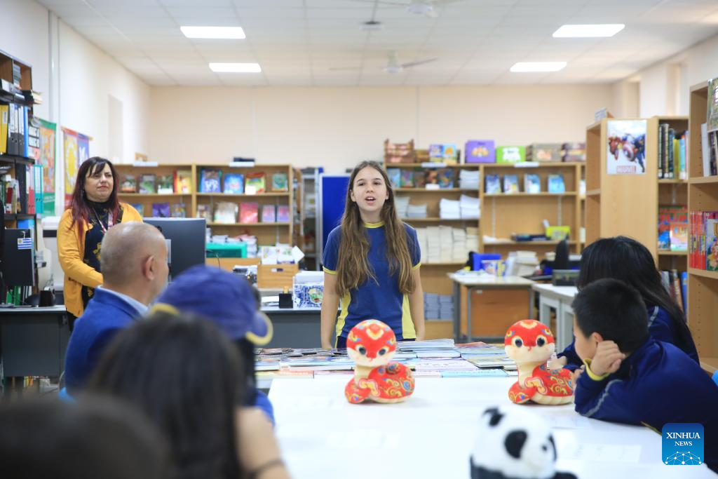 A student shares her experience of learning Chinese during the opening ceremony of a Chinese reading corner at the library of St. Clare College Pembroke Secondary School in Pembroke, Malta, on April 29, 2025. A Chinese reading corner was inaugurated Tuesday at the library of St. Clare College Pembroke Secondary School in northeastern Malta, marking the third such facility established by the Chinese Embassy in Malta on local campuses. (Xinhua/Chen Wenxian)
