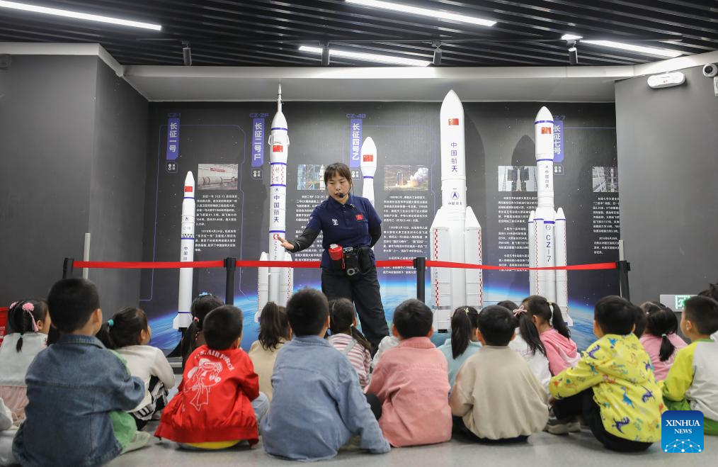 A docent introduces rocket knowledge at an aerospace science popularization base in a satellite manufacturing industrial park in Hebi, central China's Henan Province, April 21, 2025. (Xinhua/Du Xiaoyi)