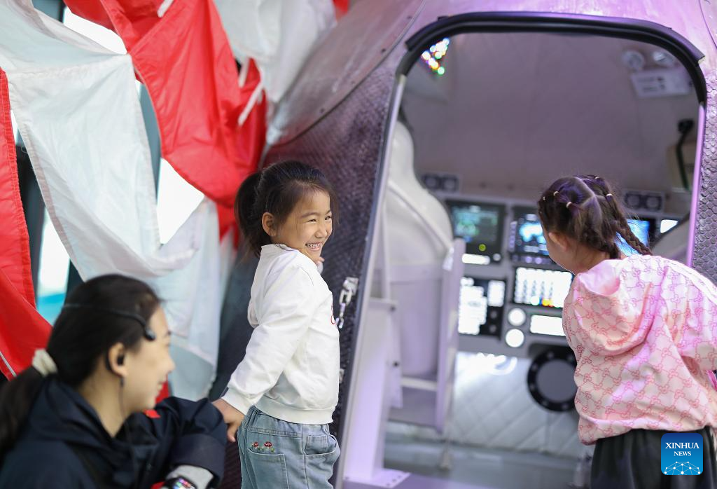 Kids visit a space station model at an aerospace science popularization base in a satellite manufacturing industrial park in Hebi, central China's Henan Province, April 21, 2025. (Xinhua/Li Jianan)