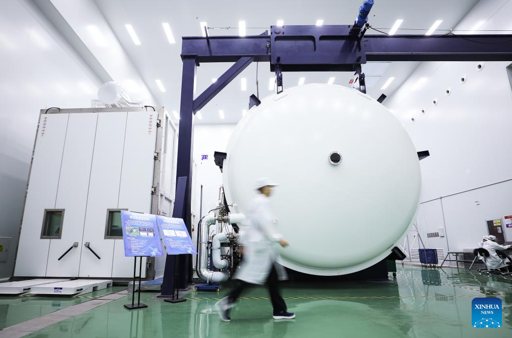 This photo taken on April 21, 2025 shows a view inside a workshop of a satellite manufacturing base in Hebi, central China's Henan Province. (Xinhua/Du Xiaoyi)