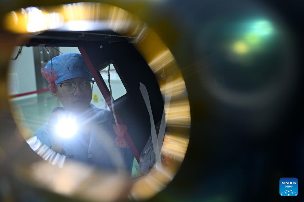 An employee checks the assembly of a satellite at a satellite manufacturing base in Hebi, central China's Henan Province, April 21, 2025. (Xinhua/Li Jianan)