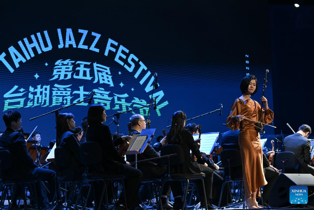 Musician Gao Xue plays erhu, a traditional Chinese instrument, during a concert of the 5th Taihu Jazz Festival in Tongzhou District of Beijing, capital of China, April 30, 2025. The 5th Taihu Jazz Festival opened in Tongzhou District of Beijing on Wednesday. (Xinhua/Chen Zhonghao)