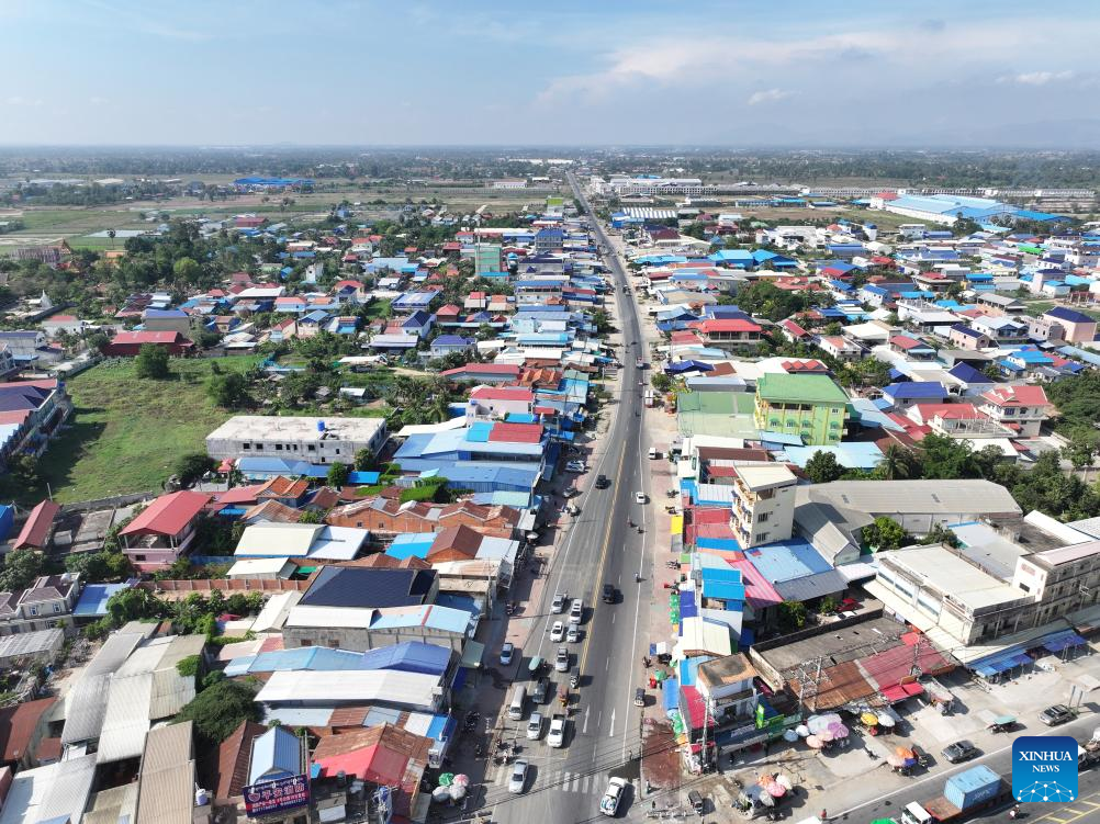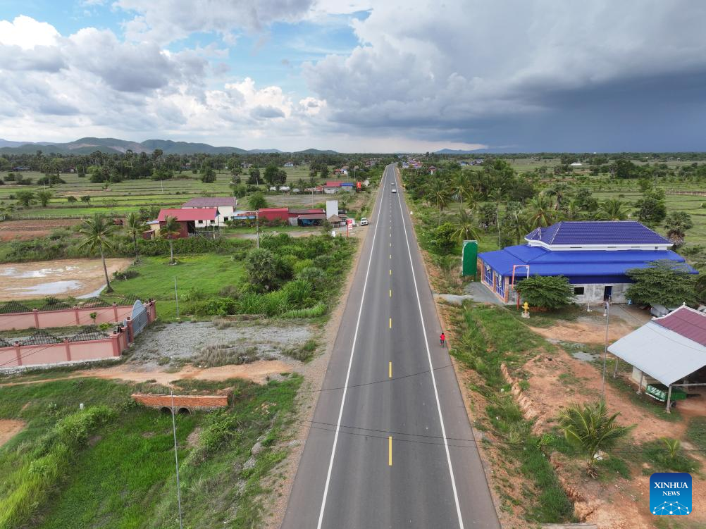 This aerial drone photo taken on April 21, 2025 shows China-funded National Road 41 in Kandal province, Cambodia. (Photo by Nitola/Xinhua)