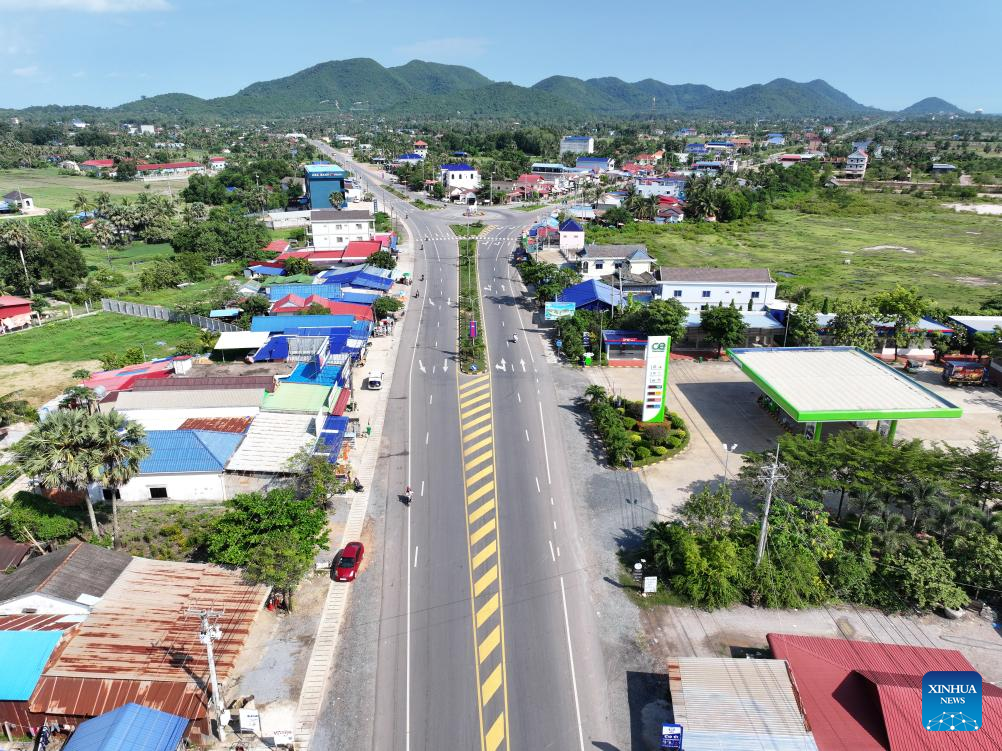 This aerial drone photo taken on April 22, 2025 shows China-funded National Road 31 in Kampot province, Cambodia. (Photo by Nitola/Xinhua)