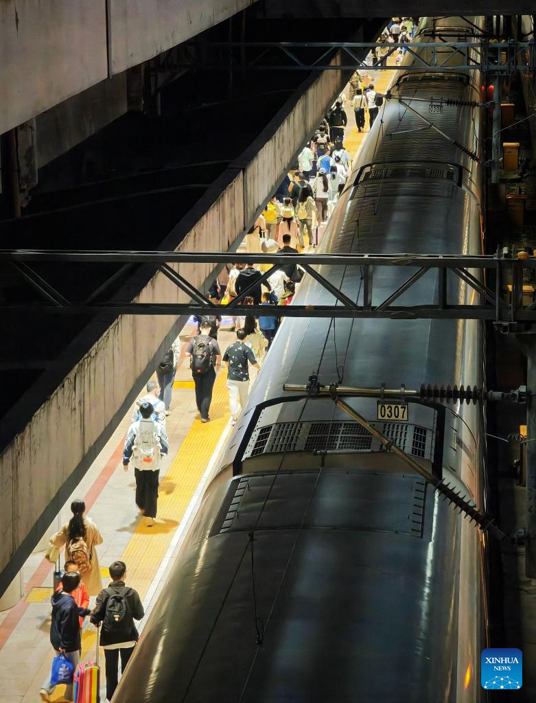 Passengers board a train at Nanjing Railway Station in Nanjing, east China's Jiangsu Province, April 30, 2025. China's railway network is expected to handle approximately 144 million passenger trips during the eight-day May Day holiday travel rush, which kicked off on Tuesday, the national railway operator said. (Photo by Su Yang/Xinhua)