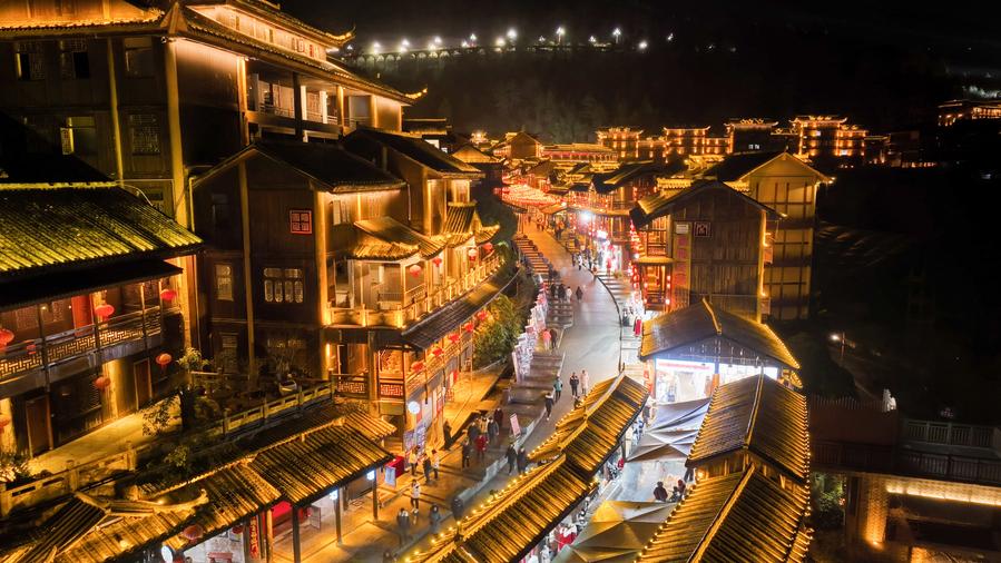 An aerial drone photo shows tourists visiting Youzhou ancient town of Youyang Tujia and Miao Autonomous County, southwest China's Chongqing Municipality, Jan. 30, 2025. (Photo by Qiu Hongbin/Xinhua)