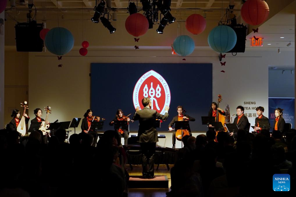 Members of the Bard East-West Ensemble perform during the annual international conference of the U.S.-China Music Institute at the China Institute in New York, the United States, May 1, 2025. (Photo by Ada Zhang/Xinhua)