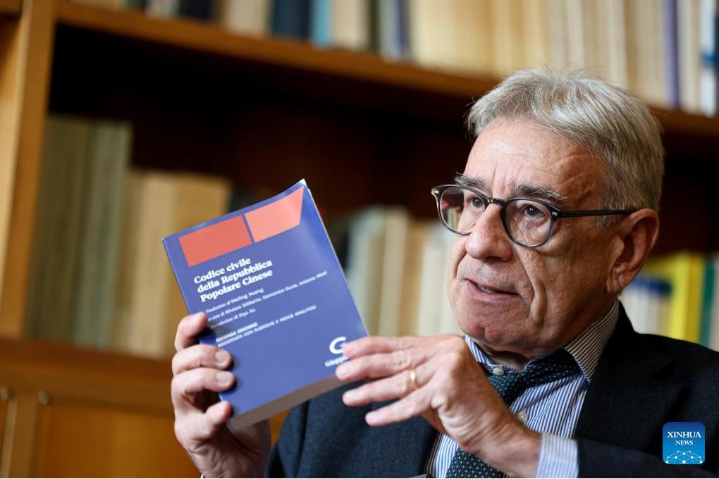 Prof. Oliviero Diliberto, dean of the faculty of law at Sapienza University of Rome, displays the Italian edition of the Civil Code of the People's Republic of China at his office in Sapienza University of Rome, Italy, April 23, 2025. (Xinhua/Li Jing)