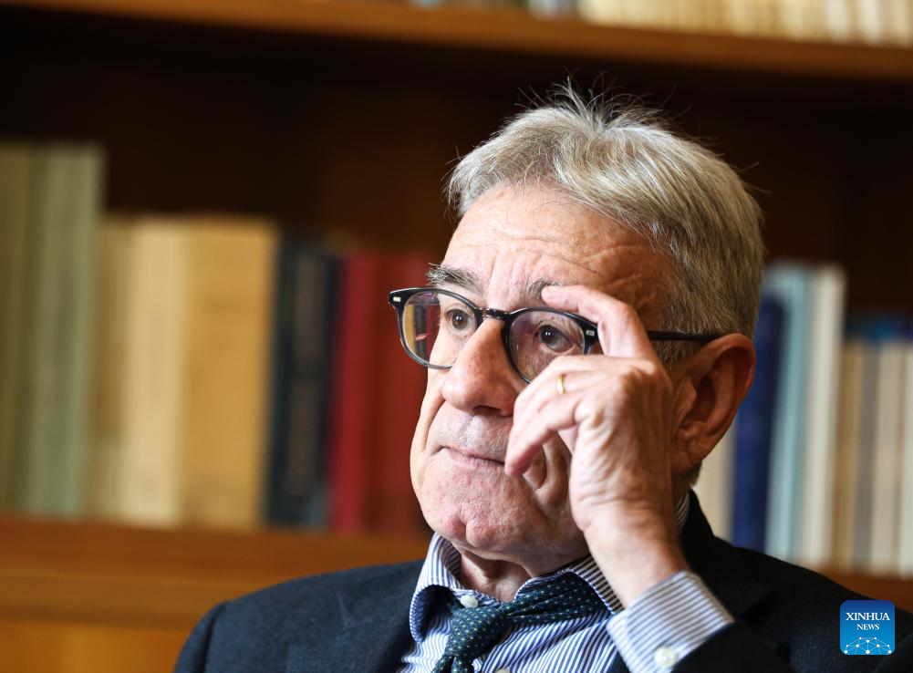 Prof. Oliviero Diliberto, dean of the faculty of law at Sapienza University of Rome, speaks during an interview with Xinhua at his office in Sapienza University of Rome, Italy, April 23, 2025. (Xinhua/Li Jing)