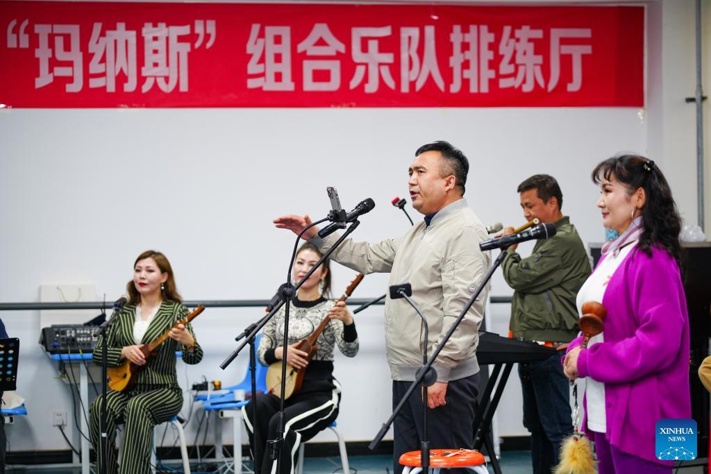A band rehearses their adapted rock version of the "Manas" epic at a practice hall in Artux City, Kizilsu Kirgiz Autonomous Prefecture in northwest China's Xinjiang Uygur Autonomous Region, April 22, 2025. (Xinhua/Xu Hongyan)