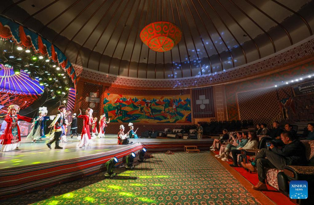 Artists and visitors dance to music at a local theater in Artux City, Kizilsu Kirgiz Autonomous Prefecture in northwest China's Xinjiang Uygur Autonomous Region, April 22, 2025. (Xinhua/Wang Fei)