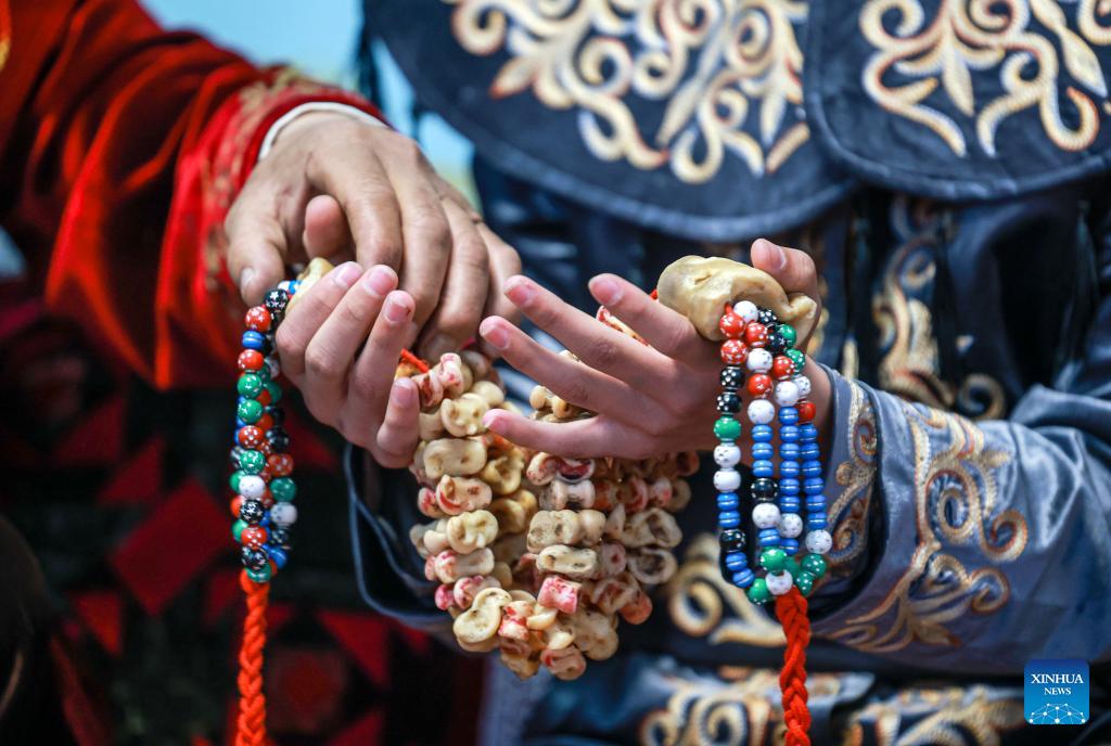 Artists perform the "Manas" epic at a local theater in Artux City, Kizilsu Kirgiz Autonomous Prefecture in northwest China's Xinjiang Uygur Autonomous Region, April 22, 2025. (Xinhua/Wang Fei)