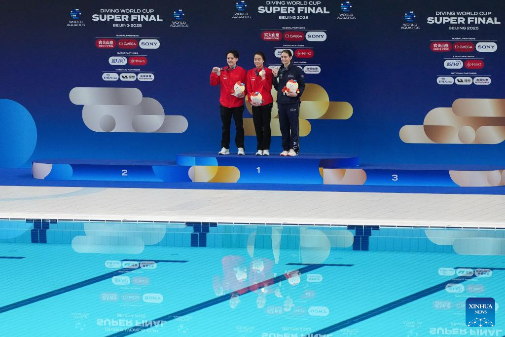 Gold medalist Chen Jia (C) of China, silver medalist Chen Yiwen (L) of China and bronze medalist Maddison Keeney of Australia pose on the podium during the awarding ceremony of the women's 3m springboard final at the World Aquatics Diving World Cup 2025 Super Final in Beijing, capital of China, May 4, 2025. (Photo by Na Yuqi/Xinhua)