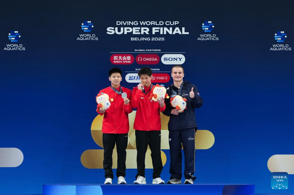 Gold medalist Zhu Zifeng (C) of China, silver medalist Cheng Zilong (L) of China and bronze medalist Cassiel Rousseau of Australia pose for photograph during the awarding ceremony of the men's 10m platform final at the World Aquatics Diving World Cup 2025 Super Final in Beijing, capital of China, May 4, 2025. (Photo by Na Yuqi/Xinhua)