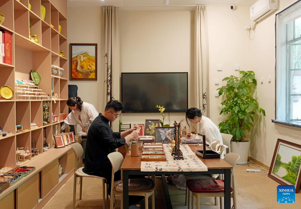Handicraft course team of "Jinkun Xinshe", a traditional Chinese-style handicraft studio, prepare exhibits for a promotion event for shops featuring traditional Chinese culture, in Xuhui District of Shanghai, east China, April 18, 2025. "Jinkun Xinshe" was founded by Si Fangfang and Li Wen, who have converted a foreign-style house into a tranquil and elegant space to offer traditional handicraft courses such as bracelet making, rope braiding, incense crafting, and gold foil painting.(Xinhua/Liu Ying)
