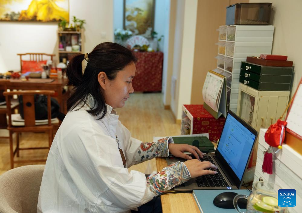 Si Fangfang uploads a social media posting on events to be held at "Jinkun Xinshe", a traditional Chinese-style handicraft studio, in Xuhui District of Shanghai, east China, April 18, 2025. "Jinkun Xinshe" was founded by Si Fangfang and Li Wen, who have converted a foreign-style house into a tranquil and elegant space to offer traditional handicraft courses such as bracelet making, rope braiding, incense crafting, and gold foil painting.(Xinhua/Liu Ying)