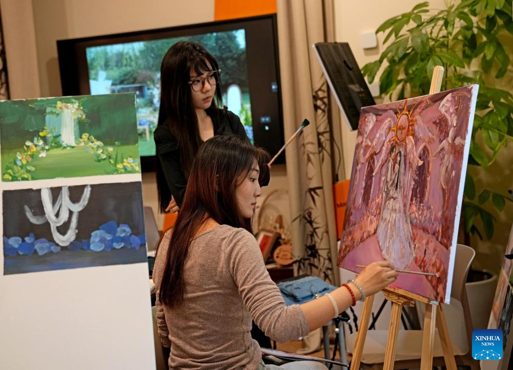 People attend a painting workshop themed on wedding at "Jinkun Xinshe", a traditional Chinese-style handicraft studio, in Xuhui District of Shanghai, east China, April 26, 2025. "Jinkun Xinshe" was founded by Si Fangfang and Li Wen, who have converted a foreign-style house into a tranquil and elegant space to offer traditional handicraft courses such as bracelet making, rope braiding, incense crafting, and gold foil painting.(Xinhua/Liu Ying)