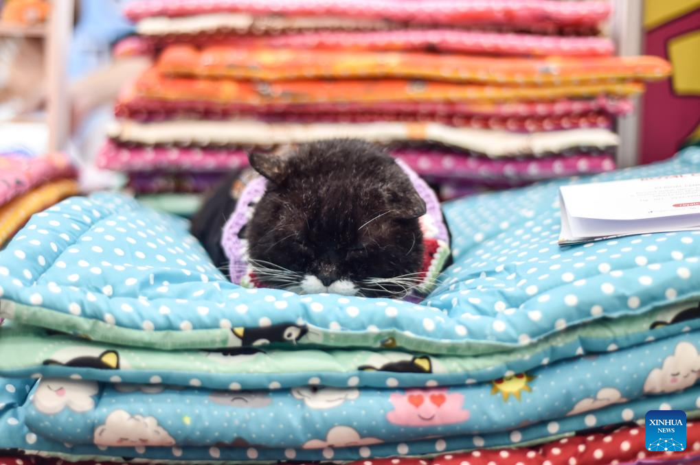 A cat is seen sleeping on a pile of blankets during Pet Fest 2025 in Tangerang, Banten, Indonesia, May 4, 2025. The event is being held here from May 2 to May 4, featuring various activities including pet lover community sessions and pet product displays. (Xinhua/Agung Kuncahya B.)