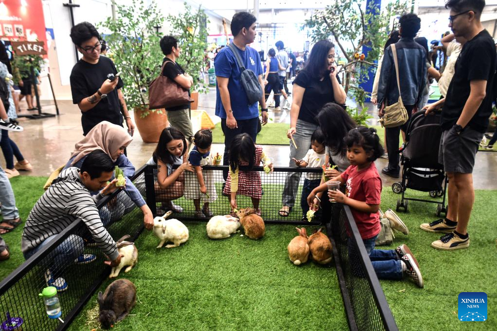 People feed rabbits during Pet Fest 2025 in Tangerang, Banten, Indonesia, May 4, 2025. The event is being held here from May 2 to May 4, featuring various activities including pet lover community sessions and pet product displays. (Xinhua/Agung Kuncahya B.)