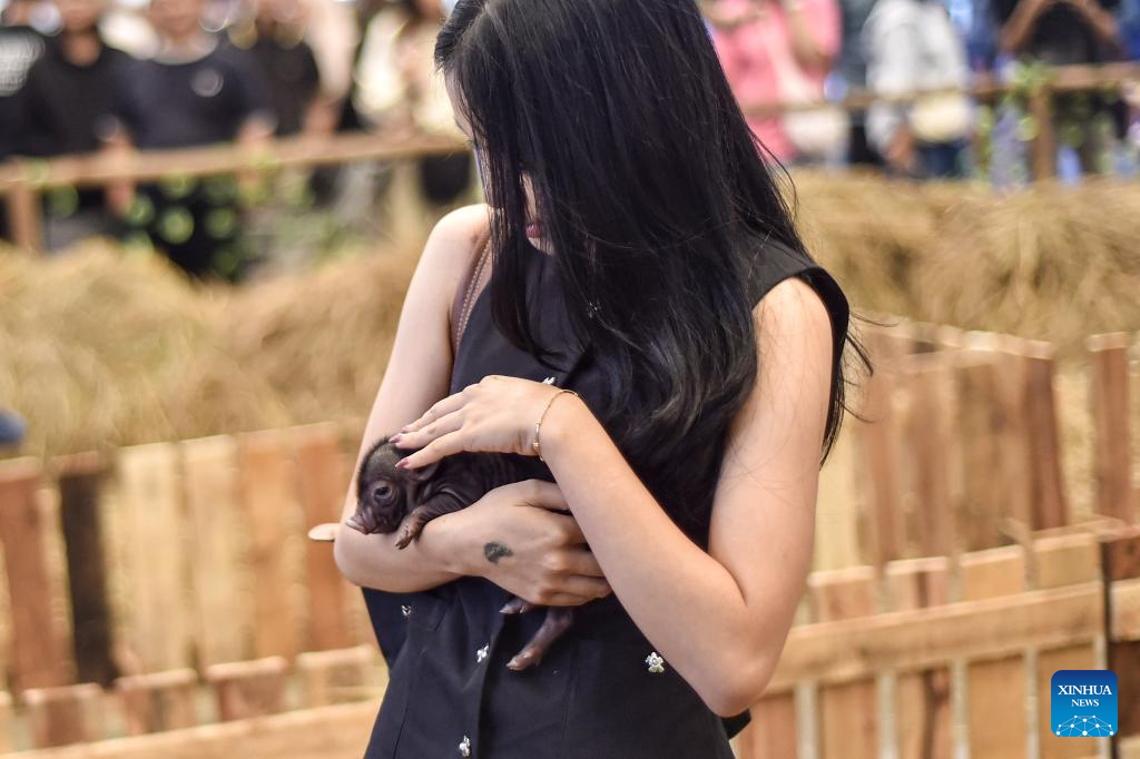 A woman touches a piglet during Pet Fest 2025 in Tangerang, Banten, Indonesia, May 4, 2025. The event is being held here from May 2 to May 4, featuring various activities including pet lover community sessions and pet product displays. (Xinhua/Agung Kuncahya B.)