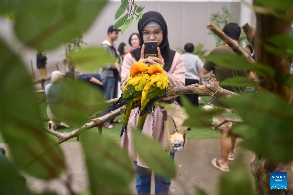 A woman takes pictures of sleeping parrots during Pet Fest 2025 in Tangerang, Banten, Indonesia, May 4, 2025. The event is being held here from May 2 to May 4, featuring various activities including pet lover community sessions and pet product displays. (Xinhua/Agung Kuncahya B.)