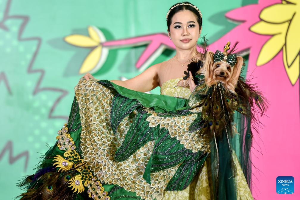 A woman and her dog participate in a fashion show for dogs and cats during Pet Fest 2025 in Tangerang, Banten, Indonesia, May 4, 2025. The event is being held here from May 2 to May 4, featuring various activities including pet lover community sessions and pet product displays. (Xinhua/Agung Kuncahya B.)