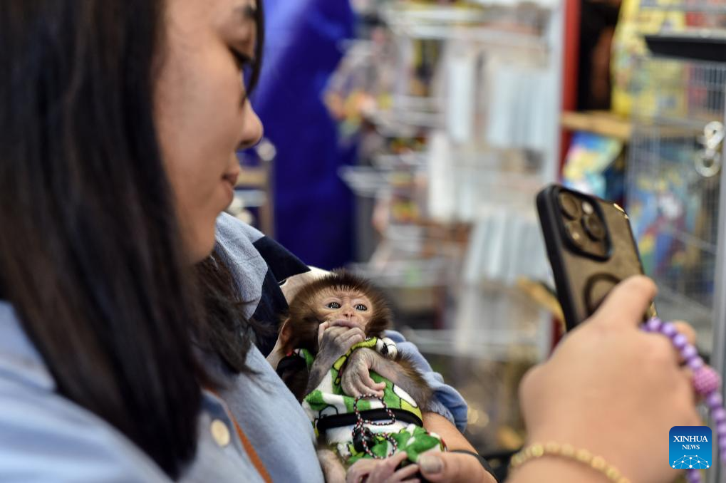 A woman takes selfies with a baby monkey during Pet Fest 2025 in Tangerang, Banten, Indonesia, May 4, 2025. The event is being held here from May 2 to May 4, featuring various activities including pet lover community sessions and pet product displays. (Xinhua/Agung Kuncahya B.)