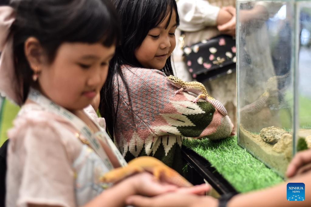 Children play with geckos during Pet Fest 2025 in Tangerang, Banten, Indonesia, May 4, 2025. The event is being held here from May 2 to May 4, featuring various activities including pet lover community sessions and pet product displays. (Xinhua/Agung Kuncahya B.)