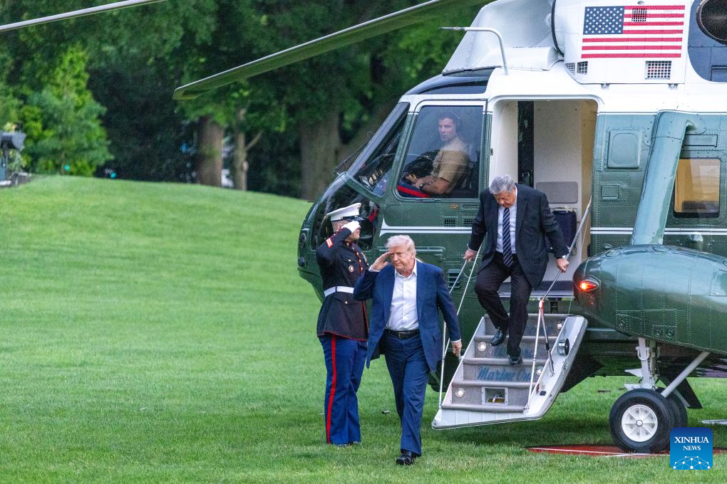 U.S. President Donald Trump (C, front) salutes upon arrival on the South Lawn of the White House in Washington, D.C., the United States, May 4, 2025. U.S. President Donald Trump said on Sunday that he is authorizing to immediately begin the process of instituting a 100 percent tariff on all movies "produced in Foreign Lands." (Xinhua/Hu Yousong)