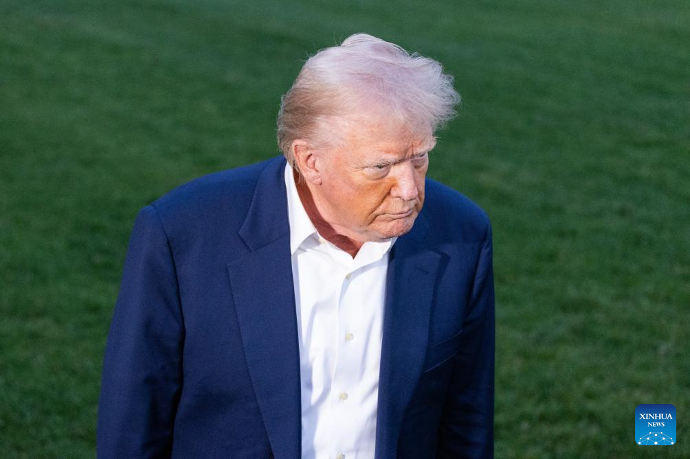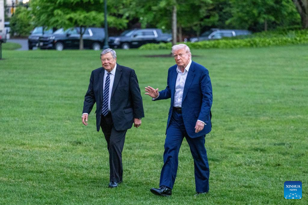 U.S. President Donald Trump takes questions from the press upon arrival on the South Lawn of the White House in Washington, D.C., the United States, May 4, 2025. U.S. President Donald Trump said on Sunday that he is authorizing to immediately begin the process of instituting a 100 percent tariff on all movies "produced in Foreign Lands." (Xinhua/Hu Yousong)
