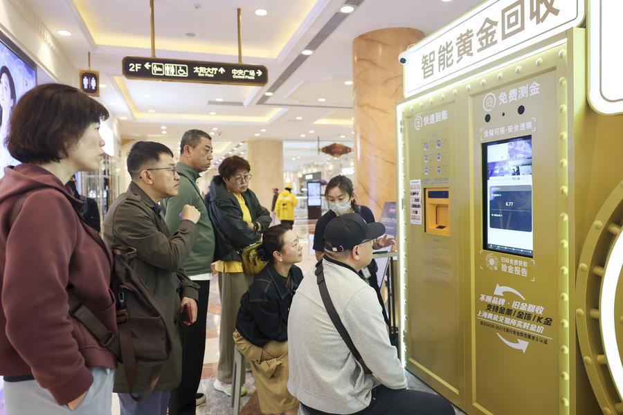 People watch the operation of a "smart gold store" at a shopping mall in Shanghai, east China, May 5, 2025. (Xinhua/Wang Xiang)