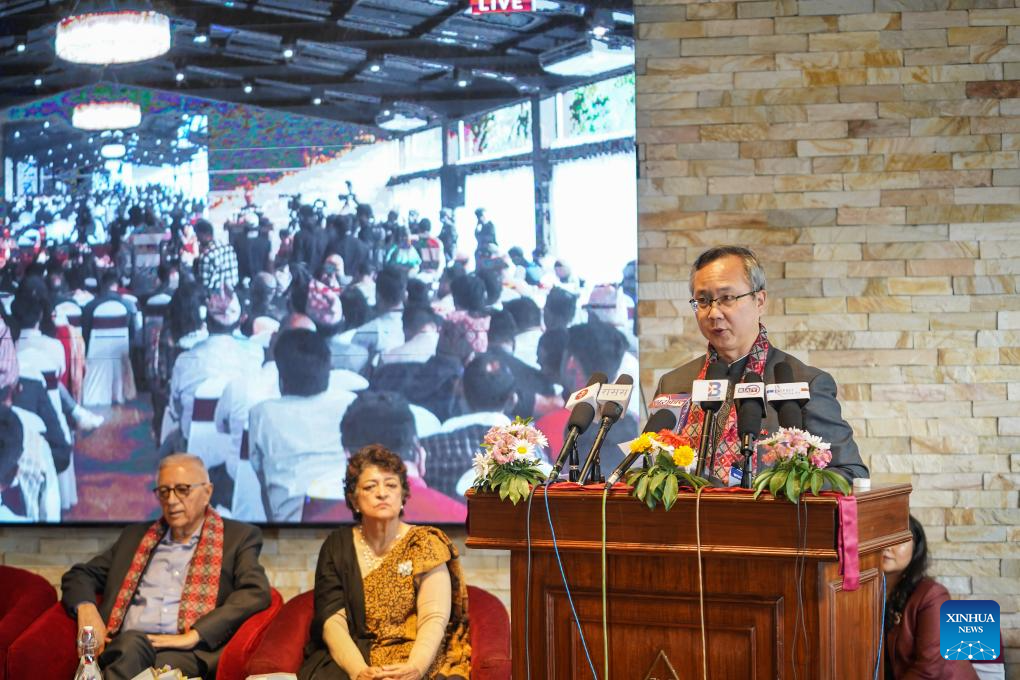 Chinese Ambassador to Nepal Chen Song (Front) speaks at the photo exhibition "legacy of friendship: 70 years of Nepal-China relations through the lens" in Kathmandu, Nepal, on May 5, 2025. The photo exhibition was held in the Nepali capital on Monday to mark the 70th anniversary of Nepal-China diplomatic relations. (Photo by Hari Maharjan/Xinhua)