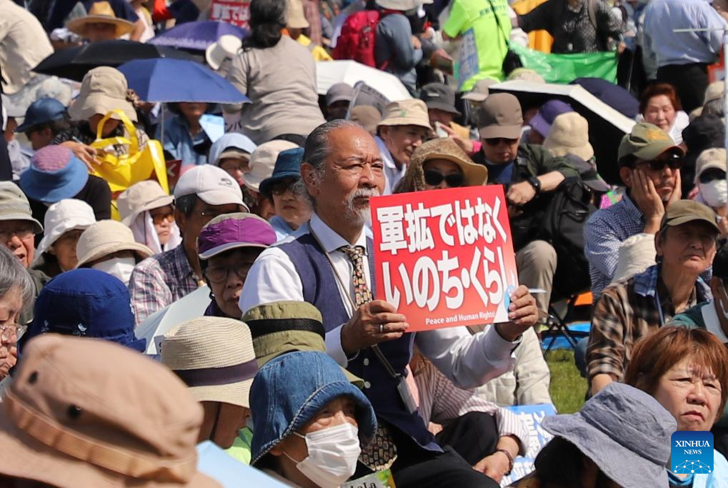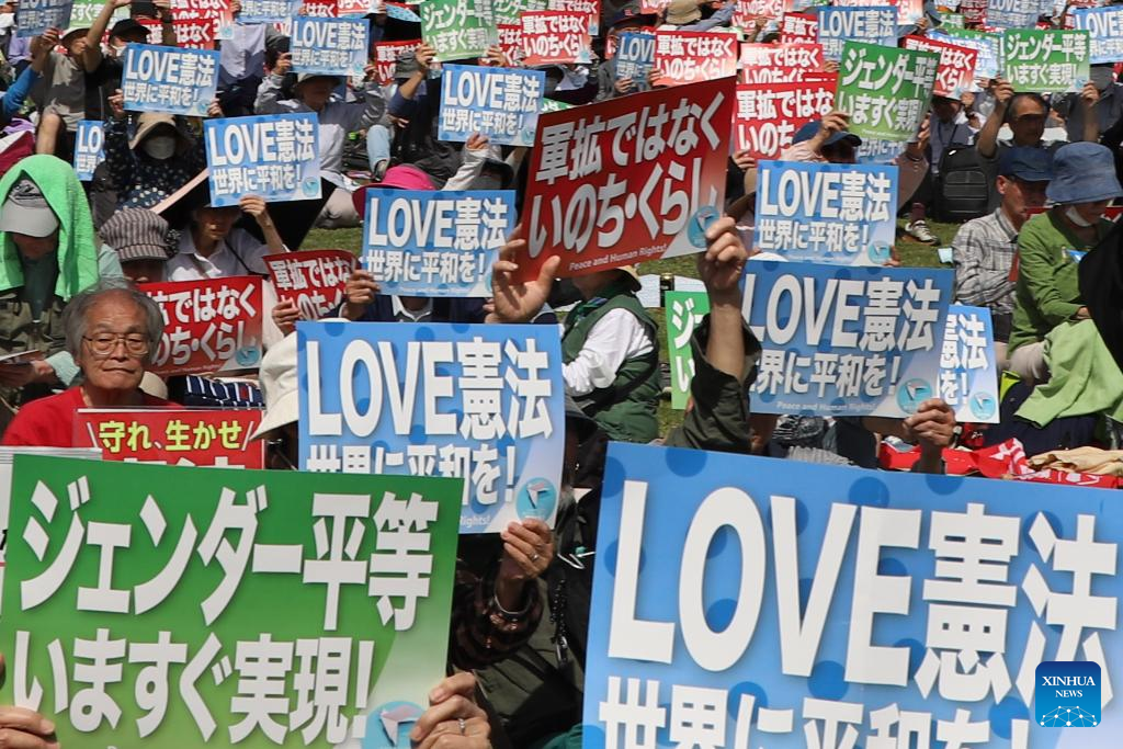 TOKYO, May 4 (Xinhua) -- Nearly 40,000 peace-seeking Japanese participated in a rally in a park in Tokyo on Constitution Memorial Day on Saturday, calling for honoring the country's pacifist constitution and opposition to war and arms expansion.